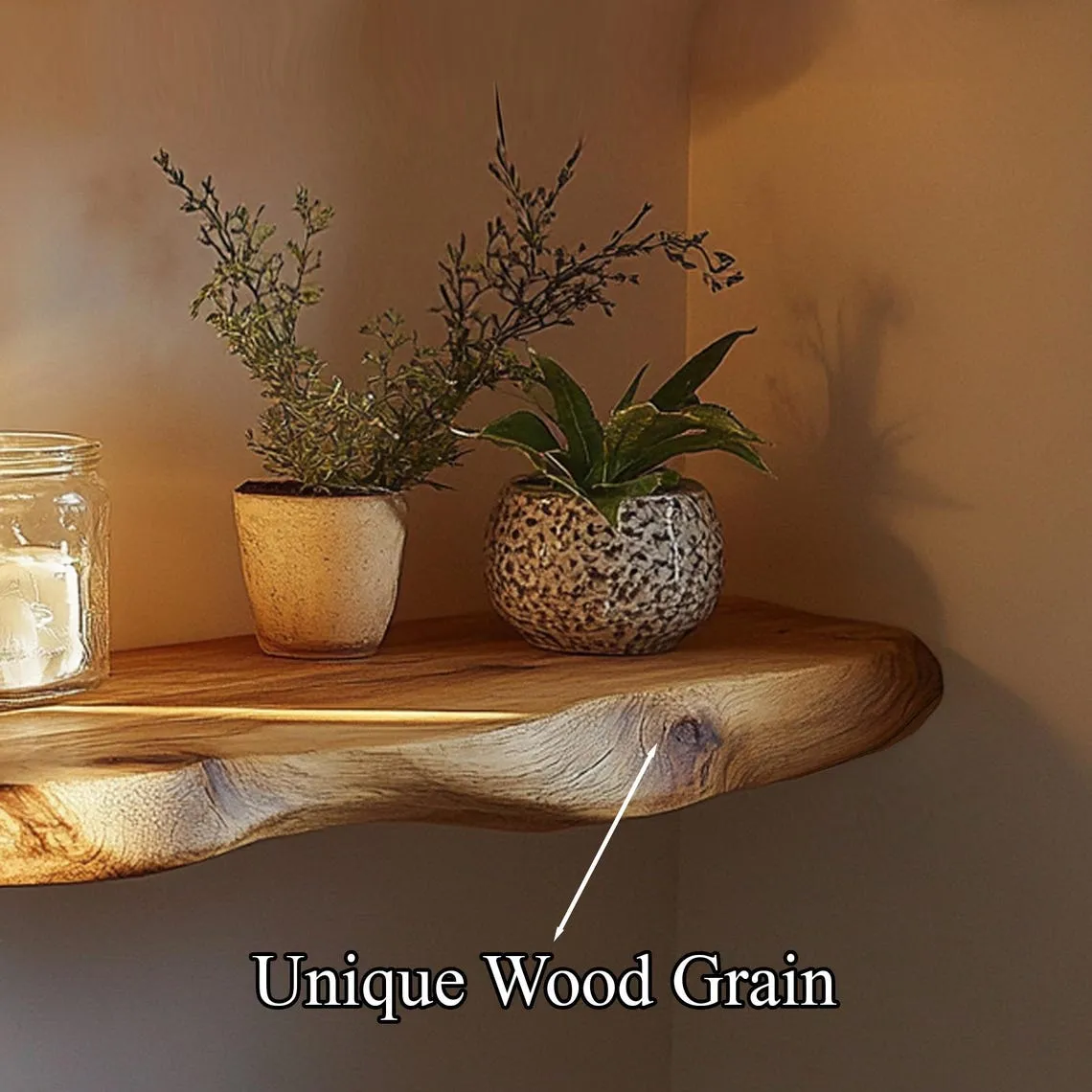 Maximize tight corners with a Custom Corner Floating Shelf made from handmade walnut live edge. The sculpted front keeps the organic outline of the tree, turning an overlooked spot into a warm, useful display. Each piece is cut, sanded, and sealed in small batches, resulting in a smooth, low‑sheen finish that highlights color and figure while protecting against daily touch.